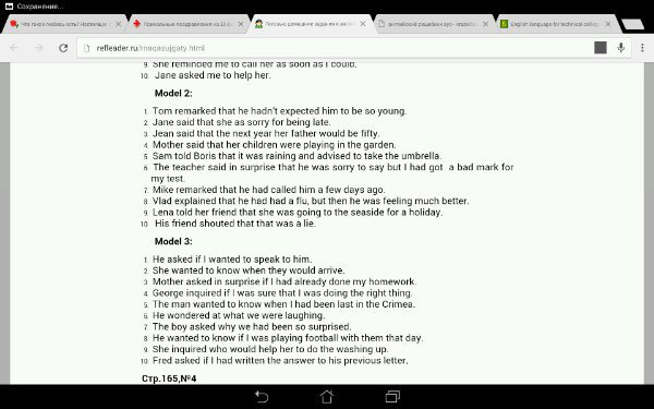 Модель 2: 1 Том заметил, что он не ожидал, что он так молод. 2 Джейн сказала, как жаль что она опоздала 3 Жан сказал, что в следующем году ее отцу будет пятьдесят 4 Мать сказала, что ее дети играли в саду, а Сэм сказал Борису, что шел дождь, и посоветовал взять зонтик. 6 Учитель сказал с удивлением, что ему было жаль сказать,что я получил плохой тест Майк заметил, что он назвал его несколько дней назад. 8 Влад объяснил, что у него был грипп, но тогда он чувствовал себя намного лучше. 9 Лена рассказала подруге, что она собирается на море для отдыха, но его друг кричал, что это была ложь. Модель 3: 1 Он спросил, хочу ли я поговорить с ним. 2 Она хотела бы знать, когда они приедут. Мать с удивлением спросила, уже сделал свою домашнюю работу. 4 Джордж спросил, если я был уверен, что я делал правильно. s Мужчина Вантед знает, когда Ihad был последним в Крыму. 6 Он удивился, что мы смеялись Мальчик спросил, почему мы были так удивлены 7 Он хотел знать ifIwas играть в футбол с ними в этот день. Она спрашивает, кто поможет ей помыть посуду. Фред спросил, написал ли я ответ на его предыдущее письмо