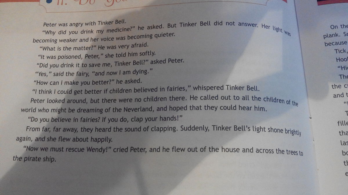 "Почему ты выпила моё лекарство? " спросил он. Но Тинкербел не ответила. Её свет становился бледнее, а голос - тише.