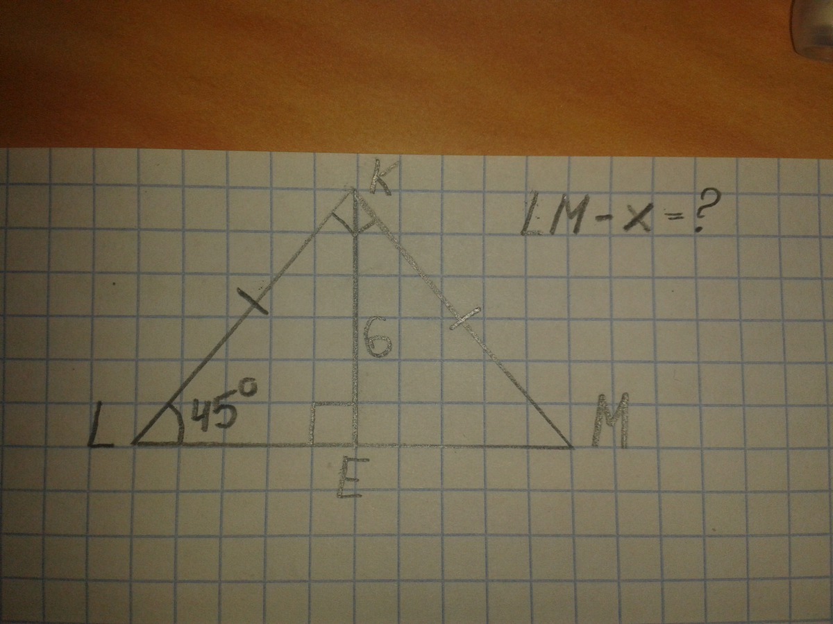Так как угол L=45°, следовательно LE=KE=EM.Значит LM=2KE=2*6=12