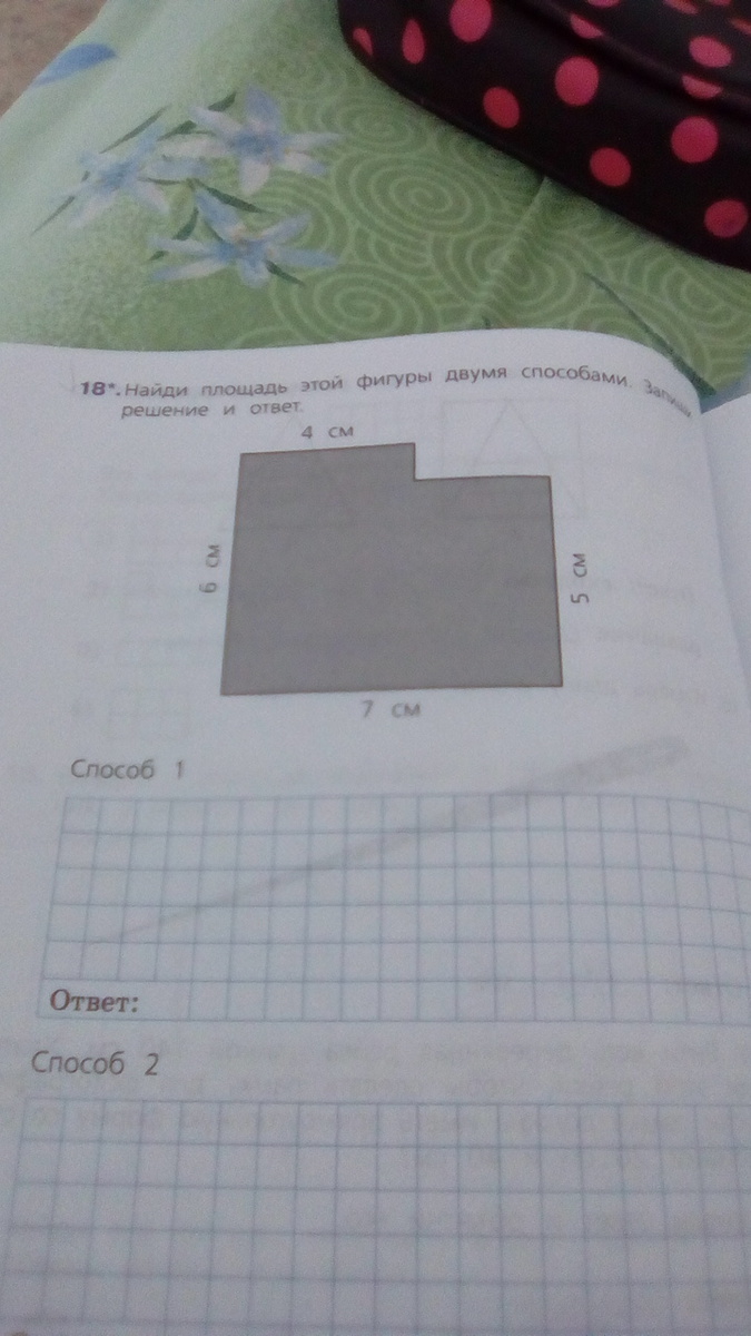 Найди площадь этой фигуры двумя способами. Запиши решение и ответ.