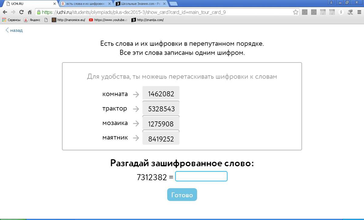 Есть слова и их шифровка в перепутанном порядке. Все эти слова записаны одним шифром. Для удобства ты можешь перетаскивать шифровки к словам. слова: