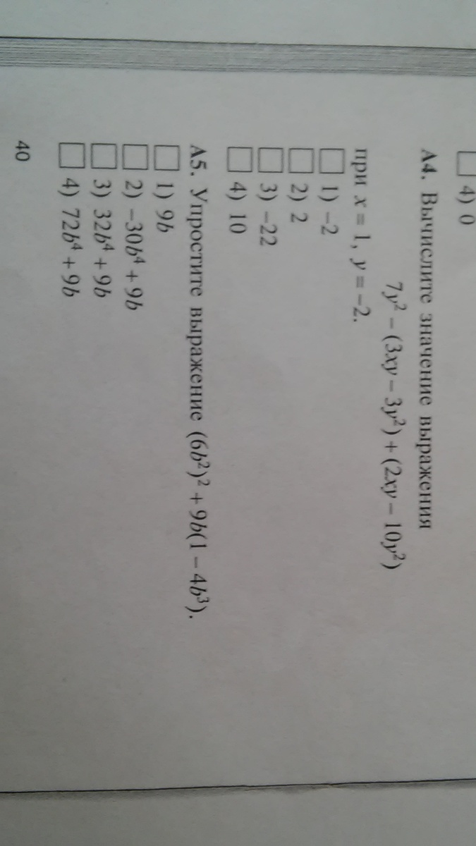 А4. 7y^2 - (3xy-3y^2) + (2xy-10y^2)= 7y^2-3xy+3y^2=2xy-10y^2= -xy => x=-1. y=-2 => -1⋅(-2)=-2