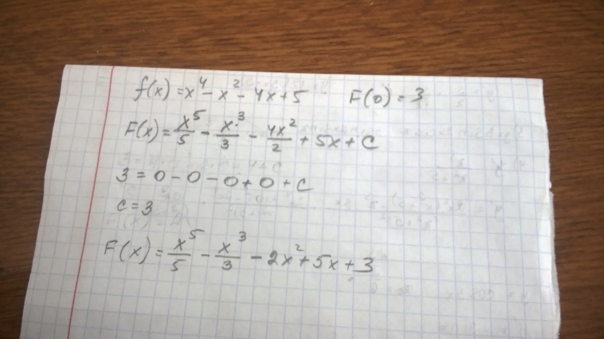 Для функции f(x)найти первообразную F(x)принимающую заданное значение в заданной точке f(x)=x^4-x^2-4x+5. F(0)=3.