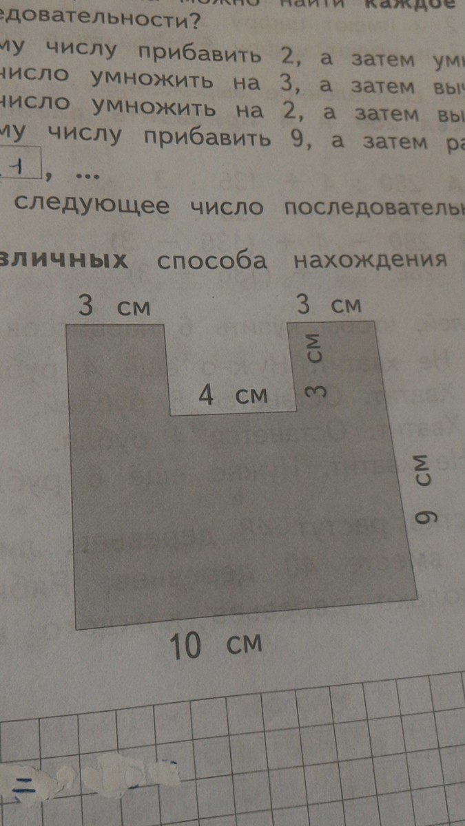 Запиши два различных способа нахождения площади многоугольника . стороны 3 см 4 см 3 см 3 см 9 см 10 см