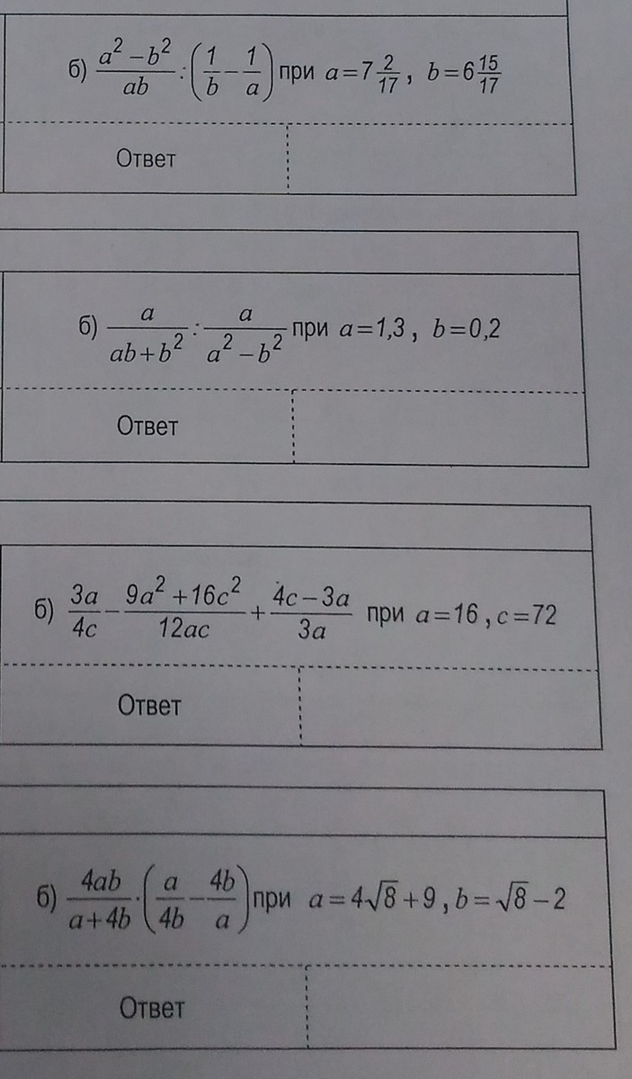 1. b) в скобках <br />1/b -1/a =(a-b)/ab,<br /><br />при делении дробь переворачиваем и будет умножение *ab/(a-b)<br /><br />(a-b)(a+b) *ab) / ab*(a-b) =<br />=a+b=7 2/17 + 6 15/17 =<br />121/17 + 117/17=(121+117)/17=<br />238/17=14<br /><br />2. b) <br />a/b(a+b) * (a-b)(a+b)/a =<br />=a(a-b)(a+b) / ab(a+b) =<br />=(a-b) / b=(1.3 -0.2) / 0.2=<br />=1.1 / 0.2 =5.5<br /><br />3. b) общий знаменатель 12ac<br /><br />(9a² -9a²-16c²+4c(4c-3a) / 12ac =(-16c² +16c² -12ac) / 12ac= -12ac / 12ac= -1<br /><br />тк все сокращаем, то значения подставлять не надо <br /><br />4. б) в скобках <br /><br />(a² -16b²) / 4ab =<br />(a -4b)(a +4b)/ 4ab<br /><br />умножаем <br /><br />4ab(a-4b)(a+4b) /4ab(a+4b)<br />=a -4b=4√8 +9 - 4√8-2 =7<br />