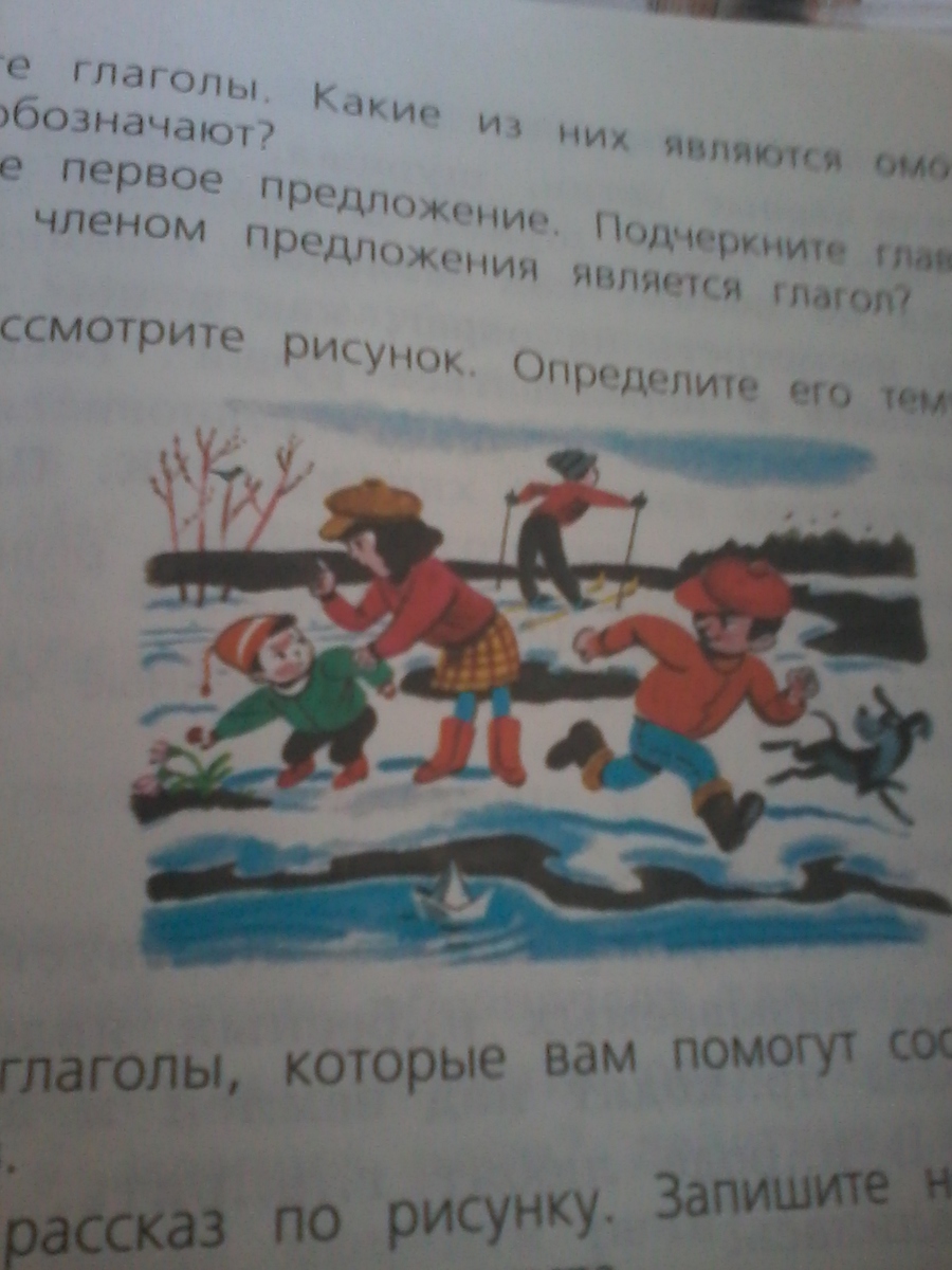 Началась весна.Снег начал таить,и появились первые проталинки.Дети пускают кораблики по воде.Мальчик Саша в зелёной куртке и красной шапке(я не вижу какого она точно цвета,поэтому пиши тот цвет который на картинке),ему хочется сорвать цветы,первые цветы.Но ем не даёт сделать этого его сестра Таня.Один мальчик позади в спортивном костюме и на лыжах едет куда то.А еще один мальчик Петя бежит вместе собакой Жучкой ,вслед за корабликом.