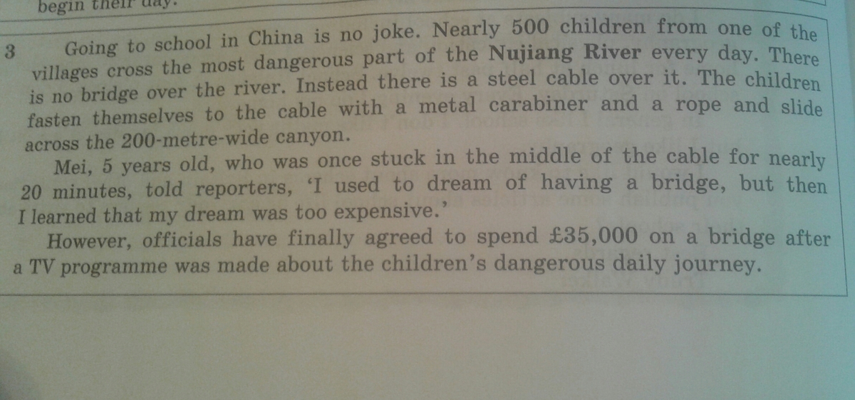 Ходить в школу в Китае это не шутка. Почти 500 детей в возрасте от одного креста большая часть реки Нуцзян каждый Там нет моста через реку. Вместо того, чтобы есть стальной трос над ним. Дети пристегиваются к кабелю с металлическим карабином и веревкой и через SLI 200-метровой ширины каньона. в середине кабеля для почти Mei, 5 лет, который был когда-то застрял на 20 минут, сообщил журналистам: "Я мечтал иметь мост, Uut тогда я leurned, что моя мечта была слишком дорогой." Тем не менее, чиновники, наконец, согласились потратить £ 85,000 на мосту после телевизионной программы WAA сделал о детской опасной ежедневной поездки.