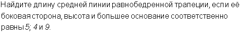 DC=5 cм. АЕ=4см. СD =9. DE= 3см так как треугольник АЕD - египедский. проведем высоту ВР так как трапеция равнобедренная то ВР=4, а РС=3. ЕР=DC-(DE+PC)= 9 -(3+3)=3. EP=AB. MN-средняя линия. MN=AB+DC/2=3+9/2=6см.