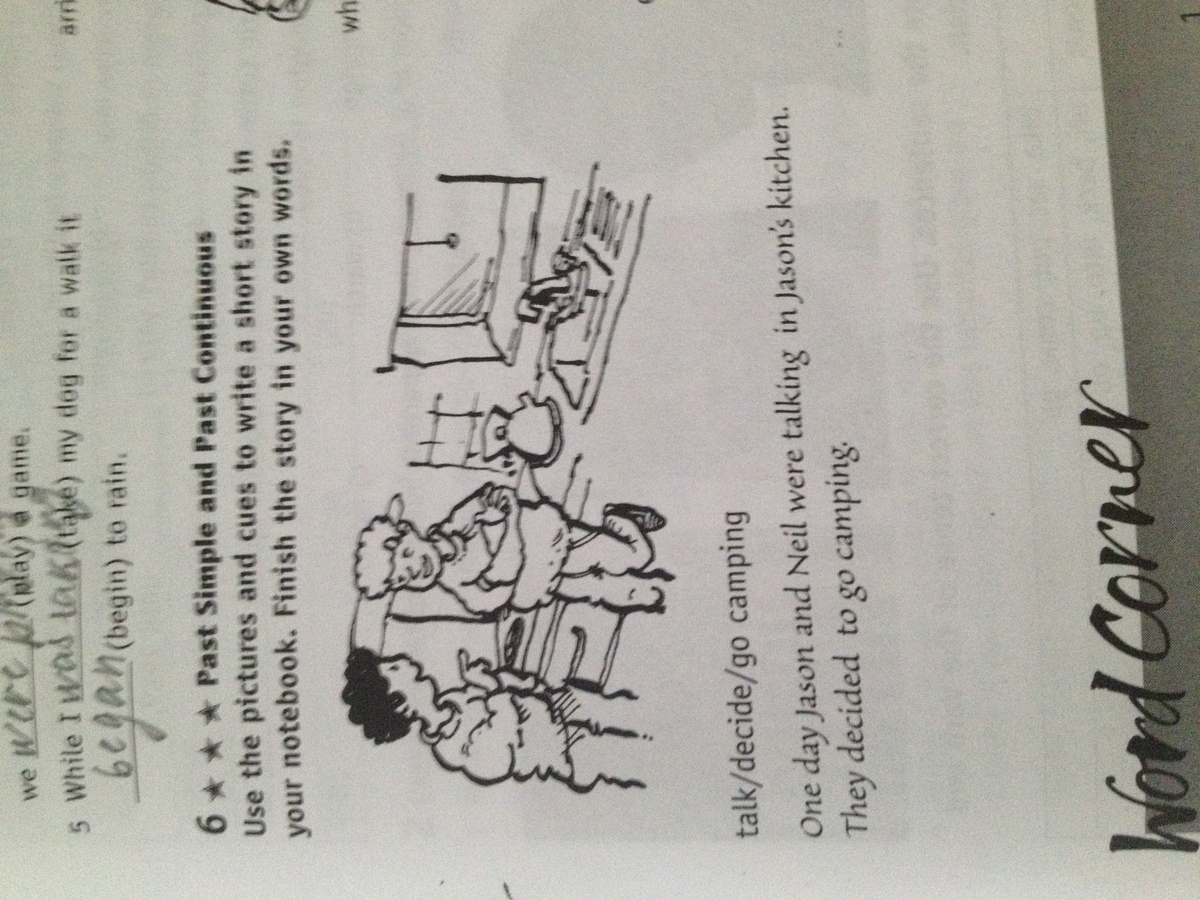 One day Jason and Neil were talking in Jason's kitchen. They desided to go camping. While they were walking, they talked about sport cars. When they arived at river, boys dicided to put up the tent. While Jason was putting up tent, Neil made fire.