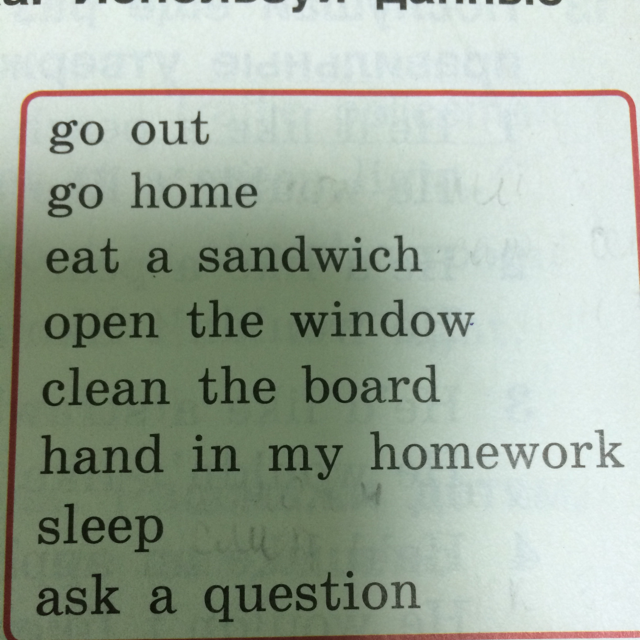 2 - иди домой, 3-съешь сендвичь, 4-открой окно, 5-сделай мое домашние задание, 6-прыгать, 7-задайте вопрос, 1-выходи