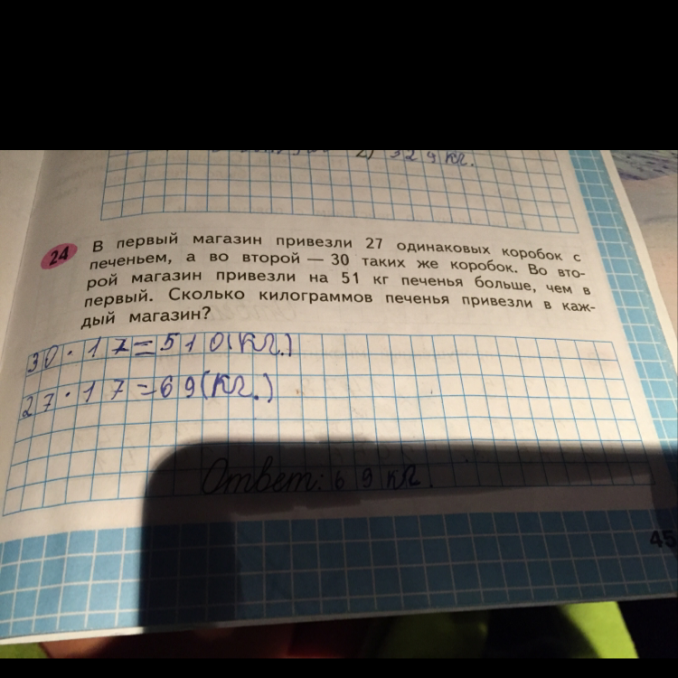 30-27=3 (на 3 коробки больше привезли во второй магазин)