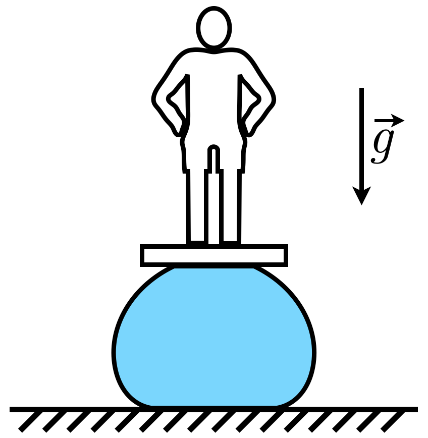 Проводится необычный эксперимент. На жёсткий горизонтальный пол кладут тонкий резиновый шар, наполненный водой объёмом V=200 л. На верхней поверхности шара размещают доску. Акробат забирается на доску и балансирует так, чтобы она принимала горизонтальное положение. Определите расстояние между доской и полом, если площадь соприкосновения мяча с доcкой составляет S1=0,03 м2, а с полом – S2=0,1 м2. Ответ выразить в см, округлив до целых. Масса акробата вместе с доской равна M=75 кг. Плотность воды составляет ρ=1000 кг/м3. Ускорение свободного падения g=10 Н/кг.