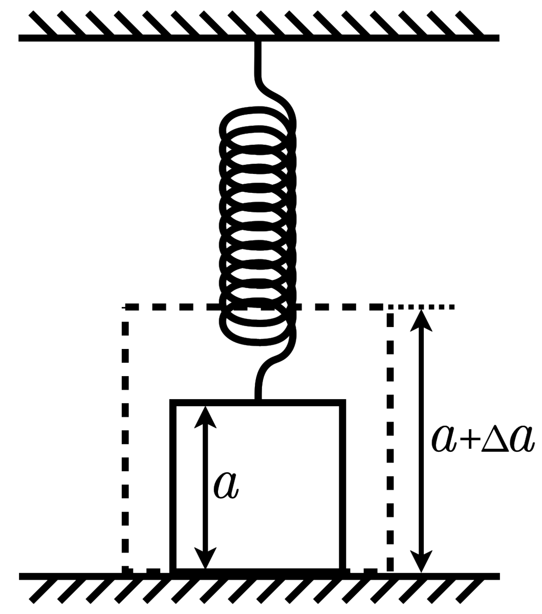 Куб со стороной a=0,2 ми массой m=30 кг прикрепили пружиной к потолку, (рисунок). Пружина не деформирована. Когда температура резко повысилась, куб быстро расширился, так что длины всех его сторон увеличились на Δa=4 см. При какой жёсткости пружины давление куба на пол не изменится? Ответ выразить в Н/м, округлив до целых. Ускорение свободного падения g=10 Н/кг.