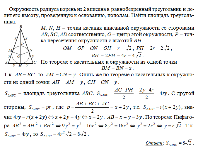 Окружность радиуса корень из 2 вписана в равнобедренный треугольник и делит его высоту , проведенную к основанию , пополам. Найти площадь треугольника
