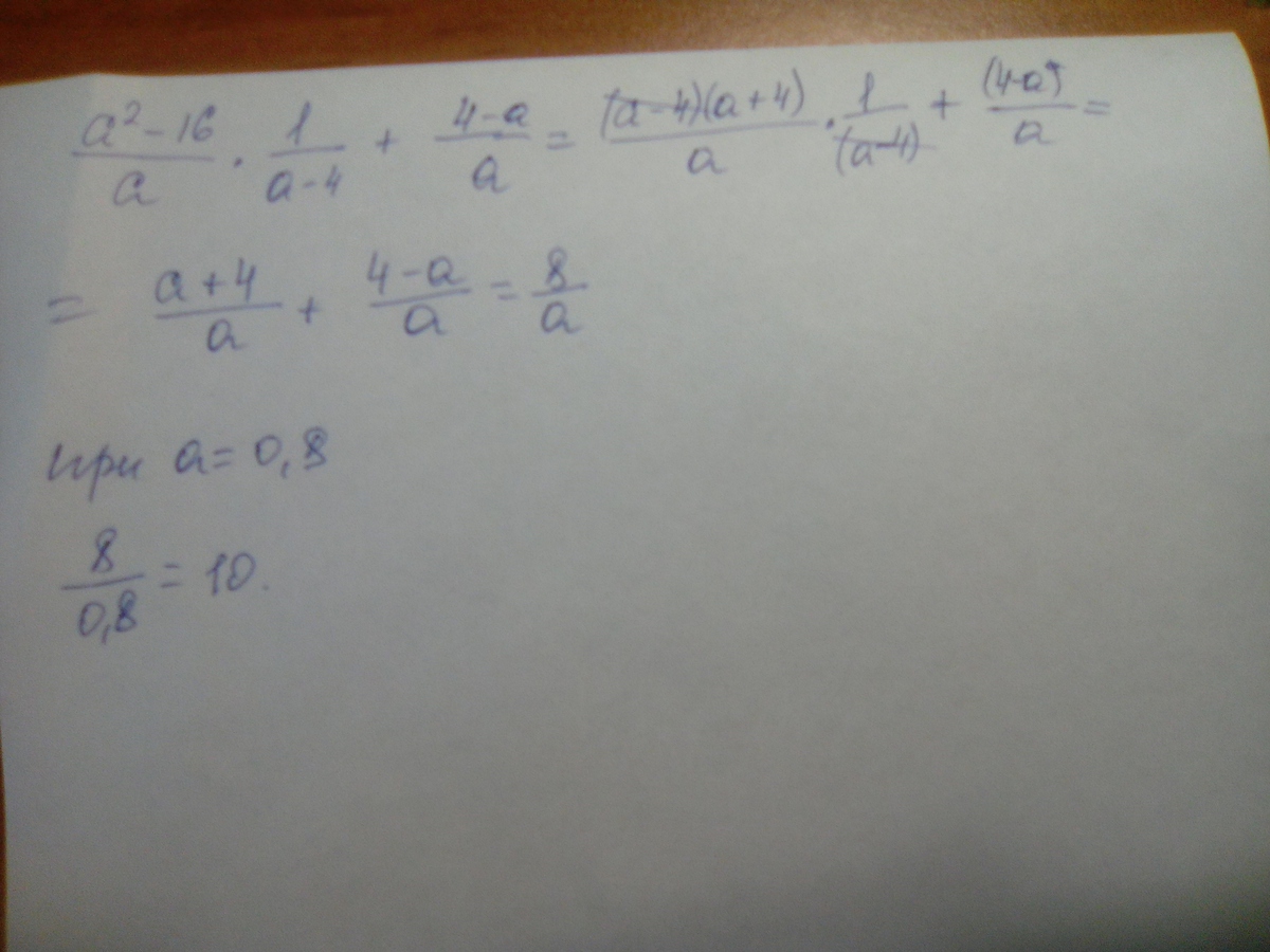упростите выражение a^2-16/a(умножить на)1/a-4(плюс)4-a/a.Найдите его значение при a=0,8.В ответ запишите полученное число.