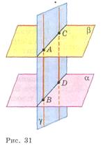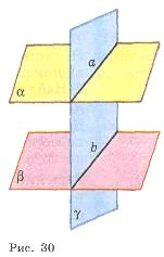 Для доказательства данного свойства рассмотрим прямые а и b, по которым параллельные плоскости α и β пересекаются с плоскостью γ (рис. 30). Докажем, что прямые а и b параллельны. Эти прямые лежат в одной плоскости (в плоскости γ) и не пересекаются. В самом деле, если бы прямые а и b пересекались, то плоскости α и β имели бы общую точку, что невозможно, так как эти плоскости параллельны.