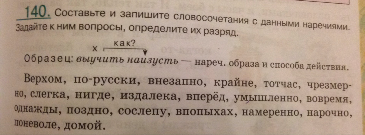 верхом на коне, говорить по-русски, замолчал внезапно, крайне неуверенно, увидеть издалека, не видеть нигде, пройти вперёд, пришёл домой, остановиться вовремя, спешил однажды, одумался поздно, споткнулся сослепу, ошибся впопыхах, остановился поневоле, испортить умышленно, оговорил намеренно, обидел нарочно, сделал поневоле, ушел домой.