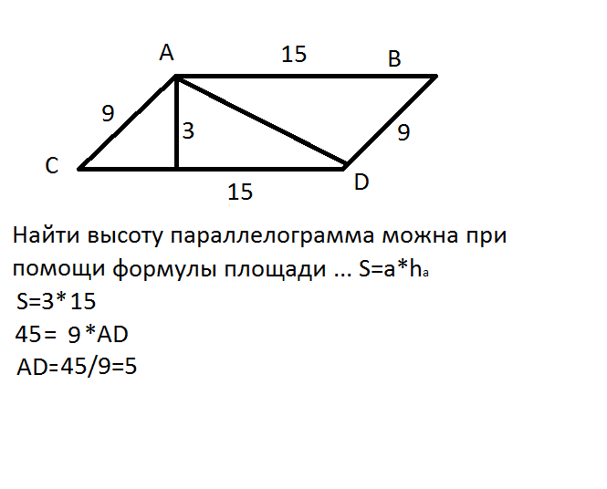 На самом деле задача легче, чем кажется. Пусть дан параллелограмм ABCD где стороны a=15,b=9 и высота h=3 на сторону a. Найдем площадь параллелограмма, которая вычисляется по формуле S=a*h, т.е. произведение основания на высоту. S=a*h=15*3=45. Точно так же S=b*H, где b основание, а H - высота, опущенная на сторону b. S=b*H=9*H=45. Тогда из этой формулы легко заметить, что H=S/b=45/9=5