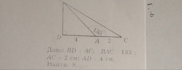 ∠BAD=180°-135°=45°,так как ∠D=90°,то ΔADB-равнобедренный,значит DA=BD=4 ,DC=DA+AC=4+2=6 ,S=DB×DC×1/2=6×4×1/2=12см²
