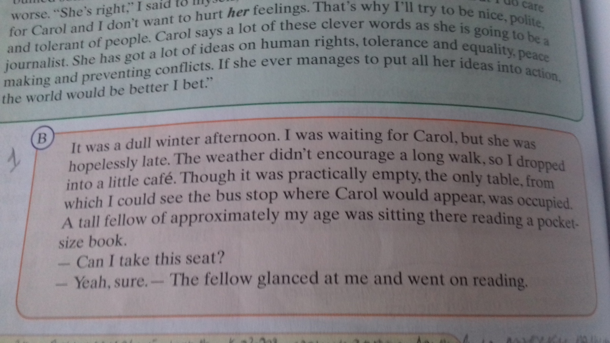 Це було нудно взимку в другій половині дня . Я чекала Керол, але вона була безнадійно пізно . Погода не сприяла довго ходити, так що я ciв у маленькому кафе.
