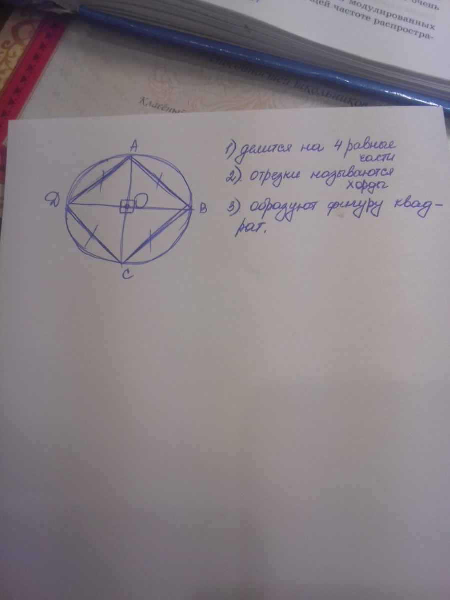 начертите окружность и проведите в ней два перпендикулярных диаметра. На сколько равных частей они разбили окружность? соединить соседние концы этих диаметров отрезками.Как можно назвать эти отрезки? Какую фигуру они образуют?