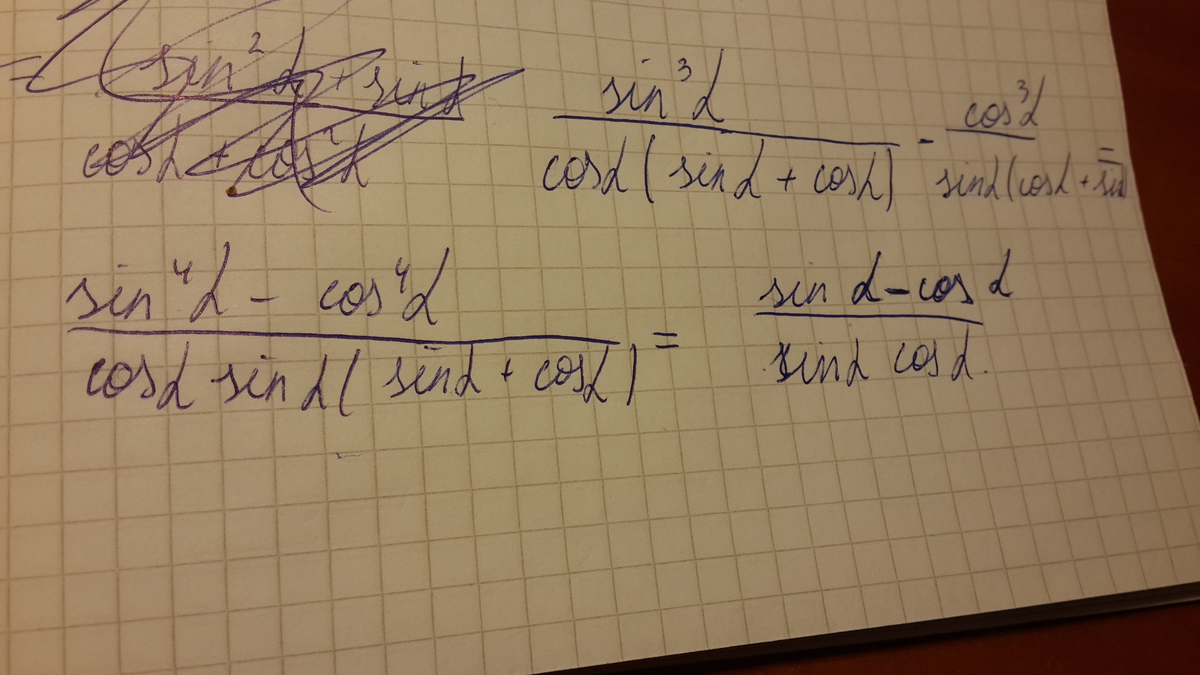 (sin⁴α -cos⁴α )/(sinαcosα(sinα+cosα))=((sin²α+cos²α)*(sin²α-cos²α))/(sinαcosα(sinα+cosα))=1*(sinα-cosα)*(sinα+cosα)/(sinαcosα(sinα+cosα))=(sinα-cosα)/sinαcosα