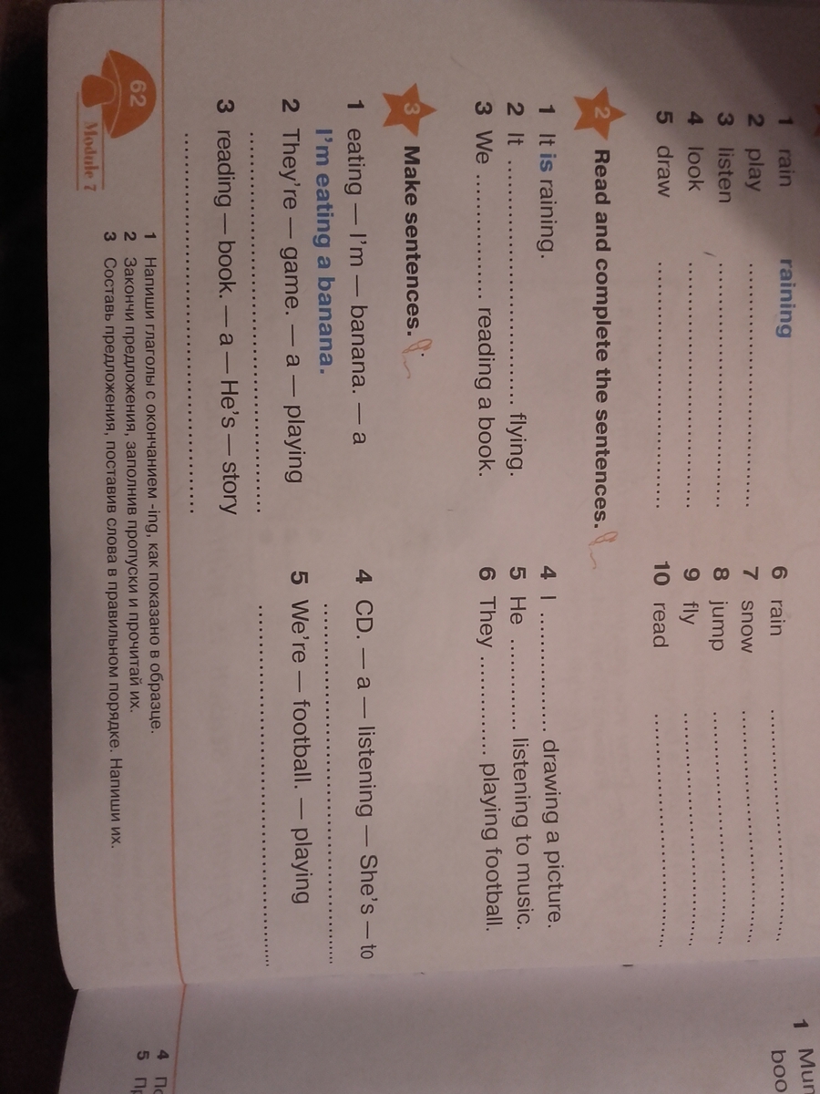 They're playing a game.<br />He's reading book a <br />story.<br />She's a listening to CD.<br />We're playning football.<br />