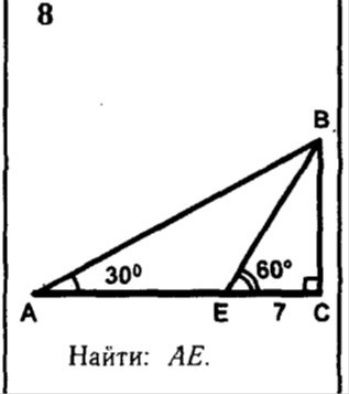 В прямоугольном треугольнике катет лежащий против угла в 30° равен половине гипотенузы .∠ЕВС=90-60=30°,значит ЕВ=ЕС×2=7×2=14.По теореме Пифагора ВС=√(ЕВ²-ЕС²)=√(14²-7²)≈12,12 . АВ=2×ВС=12,12×2=24,24. АС=√(АВ²-ВС²)=√(24,24²-12,12²)≈√440,69≈21. АЕ=АС-ЕС=21-7=14.