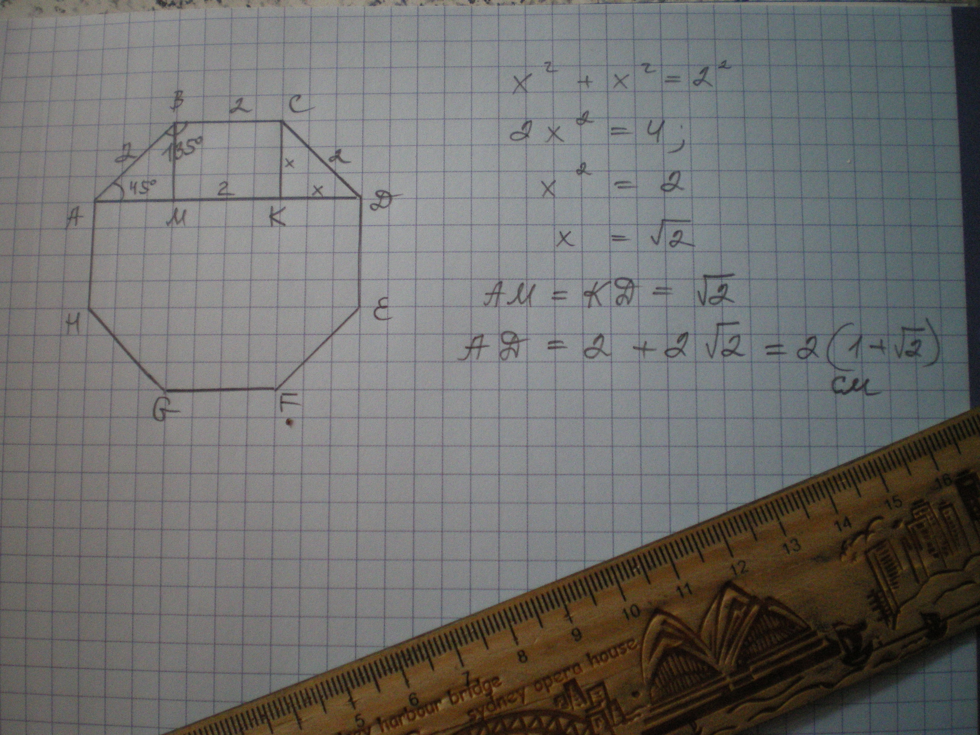 сторона правильного восьмиугольника равна 2 см найдите его среднюю по величине диагональ . рисунок к нему