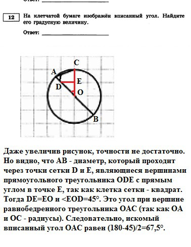 Но видно, что АВ - диаметр, который проходит через точки сетки D и E, являющиеся вершинами прямоугольного треугольника ОDE с прямым углом в точке E, так как клетка сетки - квадрат. Тогда DE=EO и <EOD=45°. Это угол при вершине равнобедренного треугольника OAC (так как OA и OC - радиусы). Следовательно, искомый вписанный угол ОАС равен (180-45)/2=67,5°.