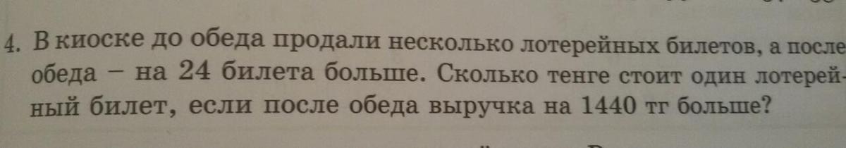 в киоске до обеда продали несколько билетов, а после обеда -на 24 билета больше.Сколько стоит один билет,если после обеда выручка на 1440 тг больше ?