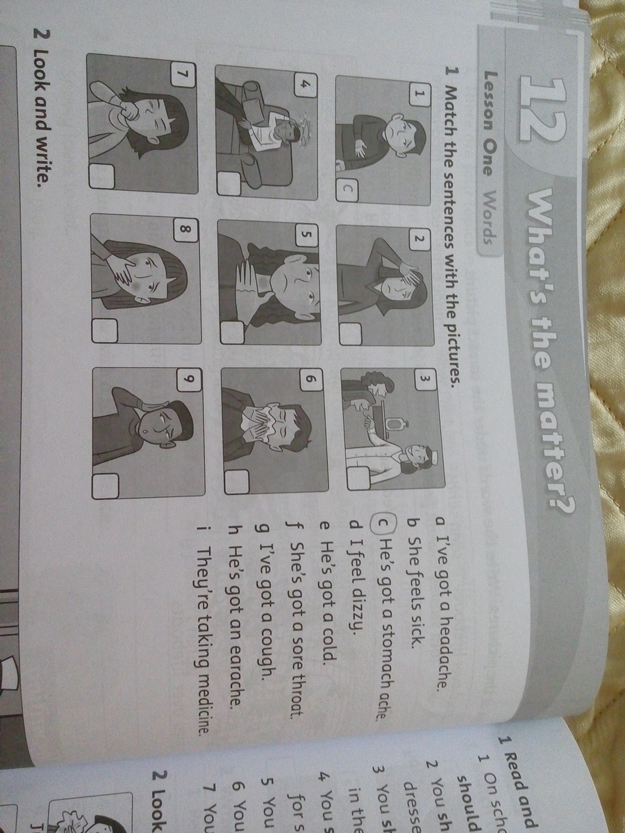 1-c 2-a 3-i 4-d 5-f 6-e 7-g 8-b 9-h 1)боль в животе 2)головная боль 3)они принимают лекарства 4)голова кружится 5)горло болит 6)простуда 7)кашель 8)чувствует себя плохо 9)ушная боль