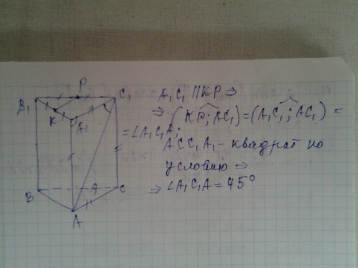 Точки K и P - соответственно середины ребер A1B1 и B1C1 правильной треугольной призмы ABCA1B1C1, у которого ВС=СС1. Вычислите градусную меру угла между прямыми КР и АС1.