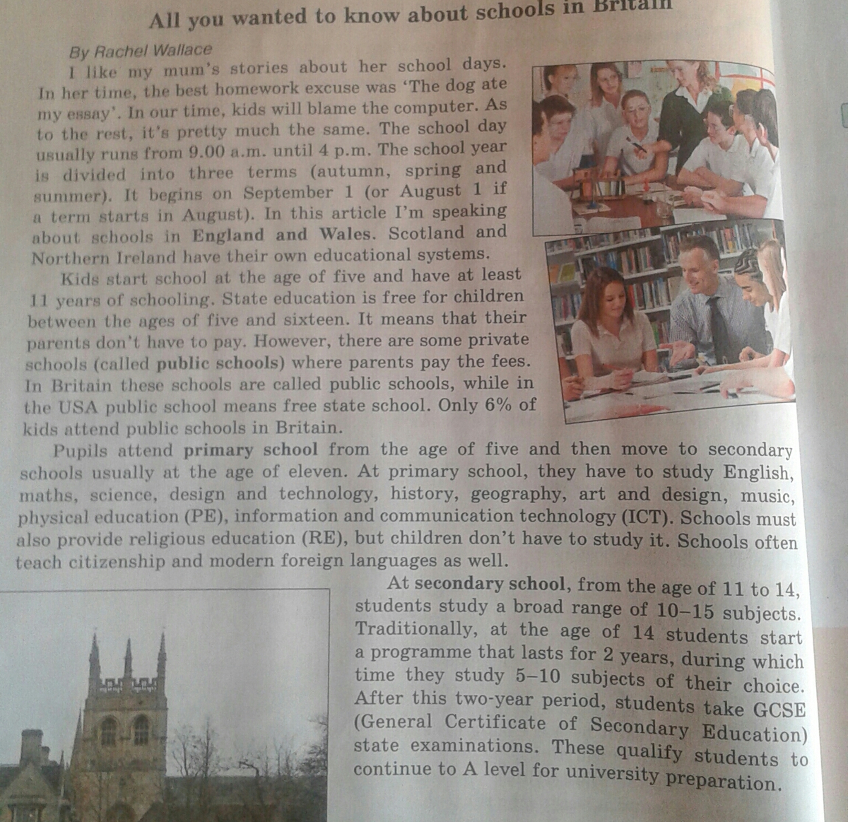 Мне нравятся рассказы моей мамы про её в школьные дни. В её время самая лучшая отмазка от домашнего задания была "собака съела моё сочинение". В наше время дети обвиняют компьютер. Для остальных это практически тоже самое. Школьный день обычно начинается в 9 утра и до 4 вечера. Учебный год делится на три семестра (осень, весна и лето). Что школьный год начинается 1 сентября или 1 августа если семестр начинается в августе. В этой статье я разговариваю про школы в Англии или уэльсе. Шотландия и Северная Ирландия имеют свои системы образования.