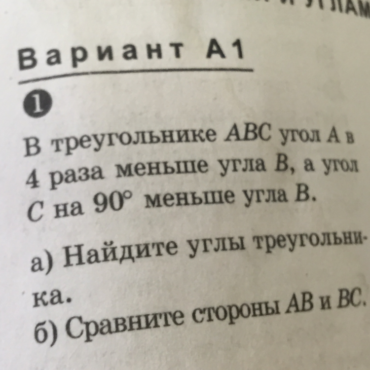 Сумма углов треугольника = 180. Пусть угол В будет х, тогда угол А = х/4 , С=х-90. Составляем уравнение х+х/4+(х-90)=180