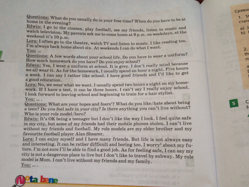 4-Well, it's OK being a teenager and I like everything. I feel safe in my city. It is not dangerous and the level of crime here is low. I can't live without my mobile phone. I don't really have a hero but I try to behave like my elder brother.
