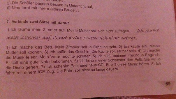 1) Ich mache das Bett, damit mein Zimmer in Ordnung ist.2) Ich kaufe ein, damit meine Mutter kocht.3) Ich spüle das Geschirr, damit die Küche sauber ist.4) Ich mache die Musik leiser, damit mein Vater schläft.5) Ich helfe meinem Freund in Englisch, damit er eine gute Note bekommt.6) Ich leihe meiner Schwester den Pulli, damit sie in die Disco geht.7) Ich schenke Paul eine neue CD, damit er diese Musik hört.8) Ich fahre mit einem ICE-Zug, damit die Fahrt nicht so lange dauert.