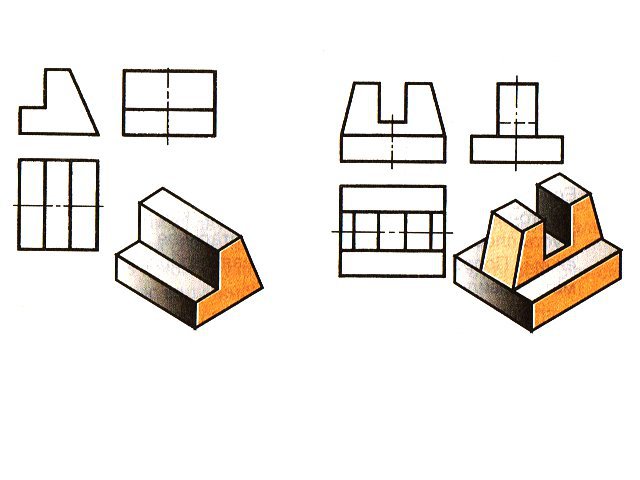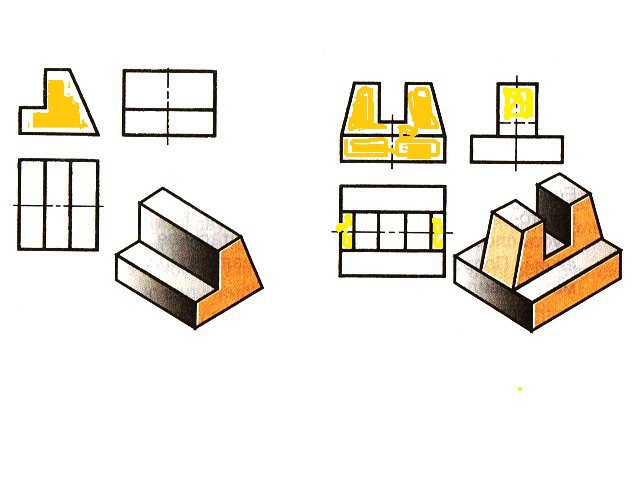 Выделите на всех проекциях соответствующие грани тем же цветом, что и на наглядных изображениях.Пожалуйста, я не понимаю.