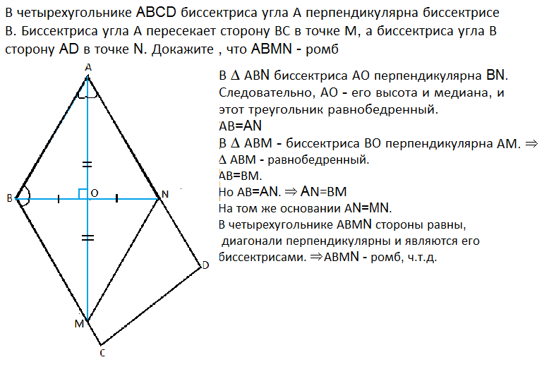 В четырехугольнике ABCD биссектриса угла А перпендикулярна биссектрисе угла В. Биссектриса угла А пересекает сторону ВС в точке М, а биссектриса угла В сторону AD в точке N. Докажите , что ABMN - ромб.