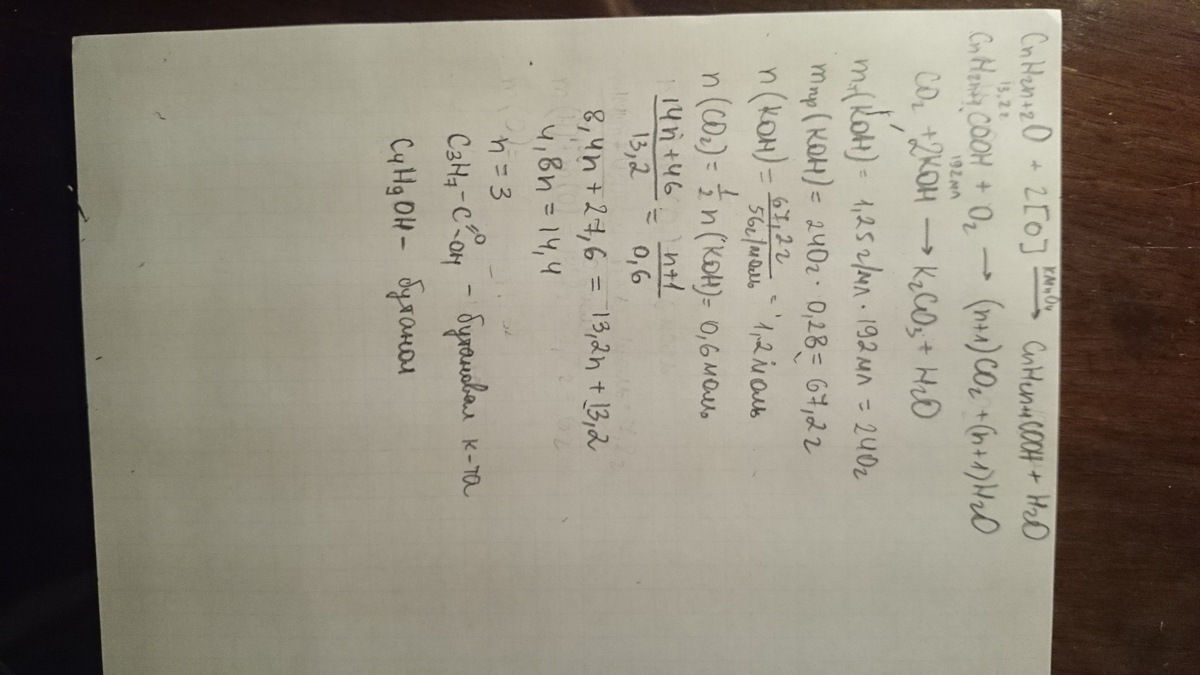 спирт подвергли окислению, при этом образовалась одноосновная карбоновая кислота. При сжигании 13,2 г этой кислоты получили оксид углерода (4), для полной нейтрализации которого потребовалась 192 мл раствора гидроксида калия с массовой долей KOH 28%(плотность 1,25 г/мл) .