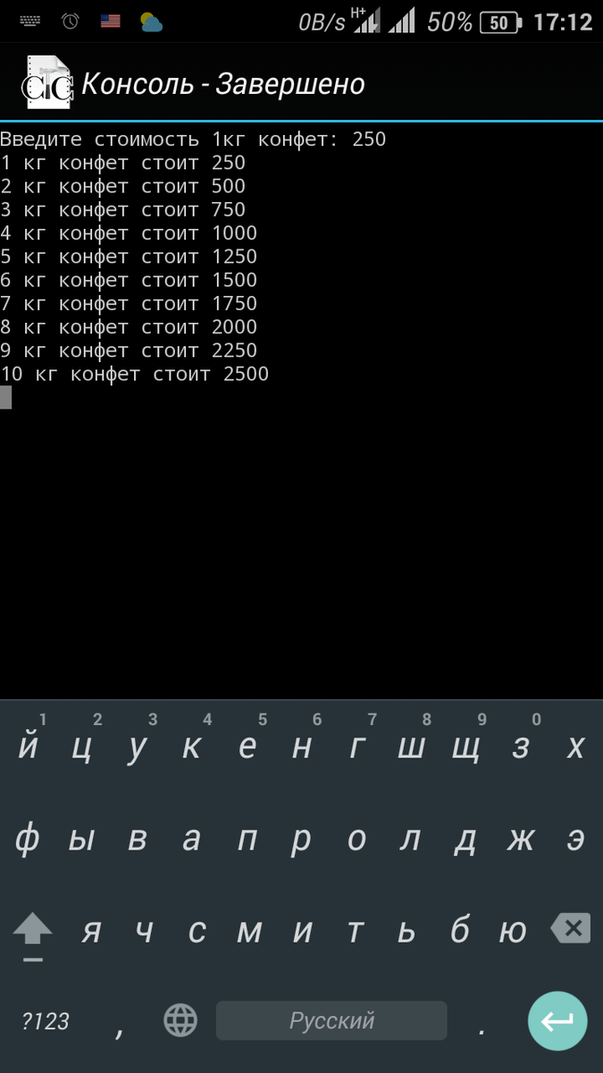 Известно сколько стоит 1 кг конфет.Вывести на экран сколько будет стоить от 1 до 10 кг конфет.