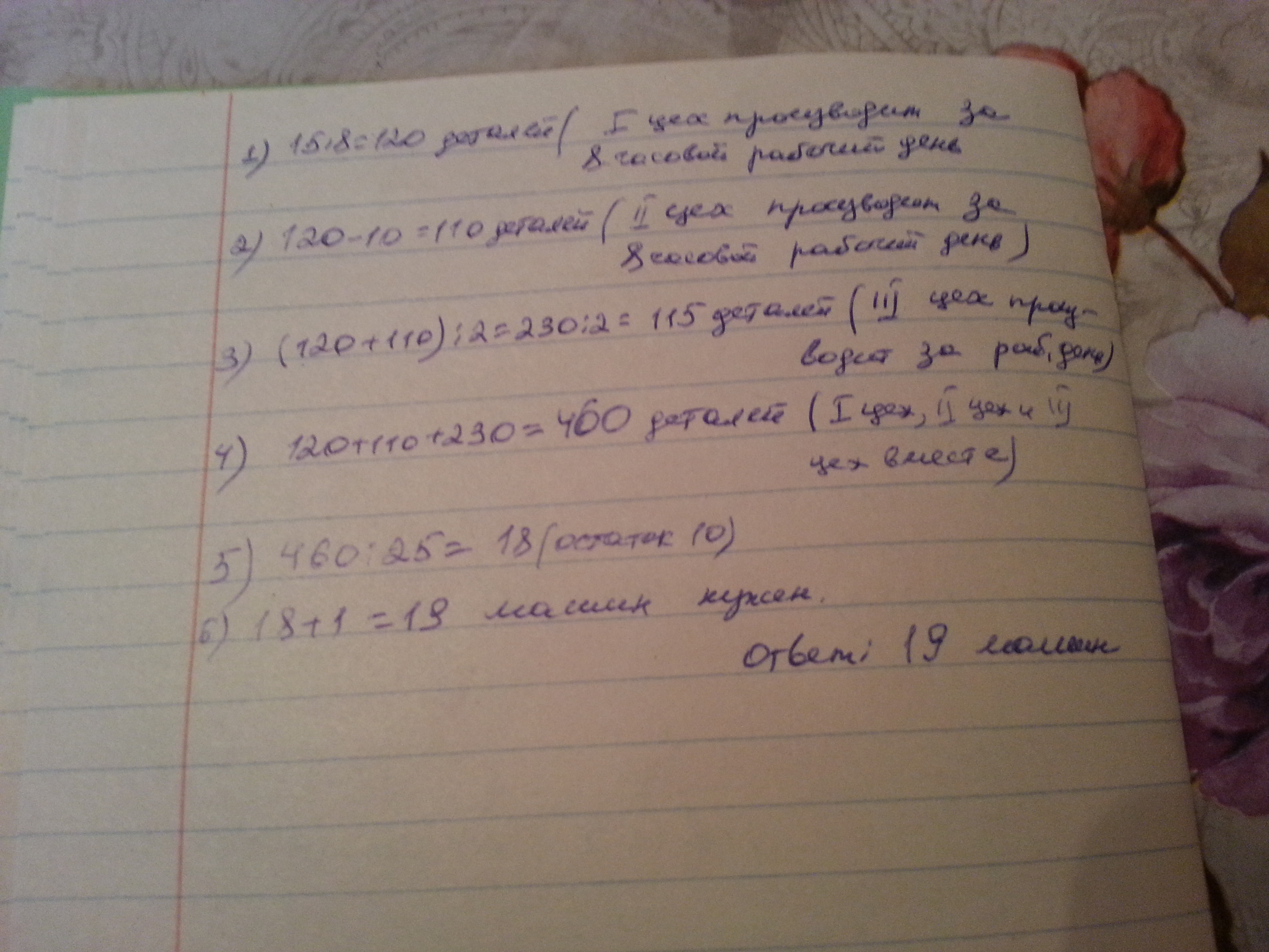 реши задачу. Первый цех производит 15 деталей в/ч. Второй производит за 8-часовой рабочий день на 10 деталей меньше, чем первый. Третий цех производит в день в два раза меньше, чем первый и второй цеха вместе. Сколько нужно машин, чтобы вывезти все детали, произведенные в трех цехах за 8-часовой рабочий день, если на одной машине можно вывезти 25 деталей???