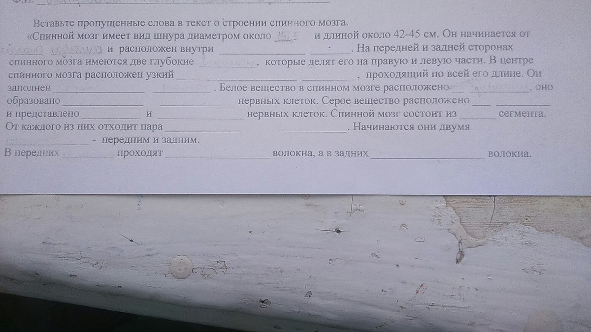 с 4- пропуска, переднюю и заднюю продольные борозды,центральный канал,спиномозговая жидкость,по краям спинного мозга,отростки нервных клеток,в центре в виде крыльев бабочки,телами нервных клеток, из 31 сигмента,спиномозговых нервов, корешками,В передних корешках проходят двигательные волокна, а чувствительные волокна входят в спинной мозг через задние корешки и оканчиваются на вставочных и исполнительных нейронах. В задних корешках есть нервные узлы, в которых и находятся скопления тел чувствительных нейронов.