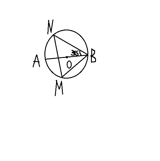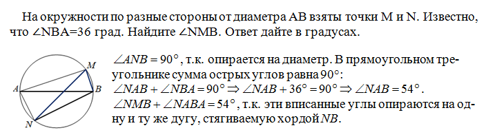 На окружности по разные стороны от диаметра АВ взяты точки М и N. Известно, что ∠NBA=36 град. Найдите ∠NMB. Ответ дайте в градусах.