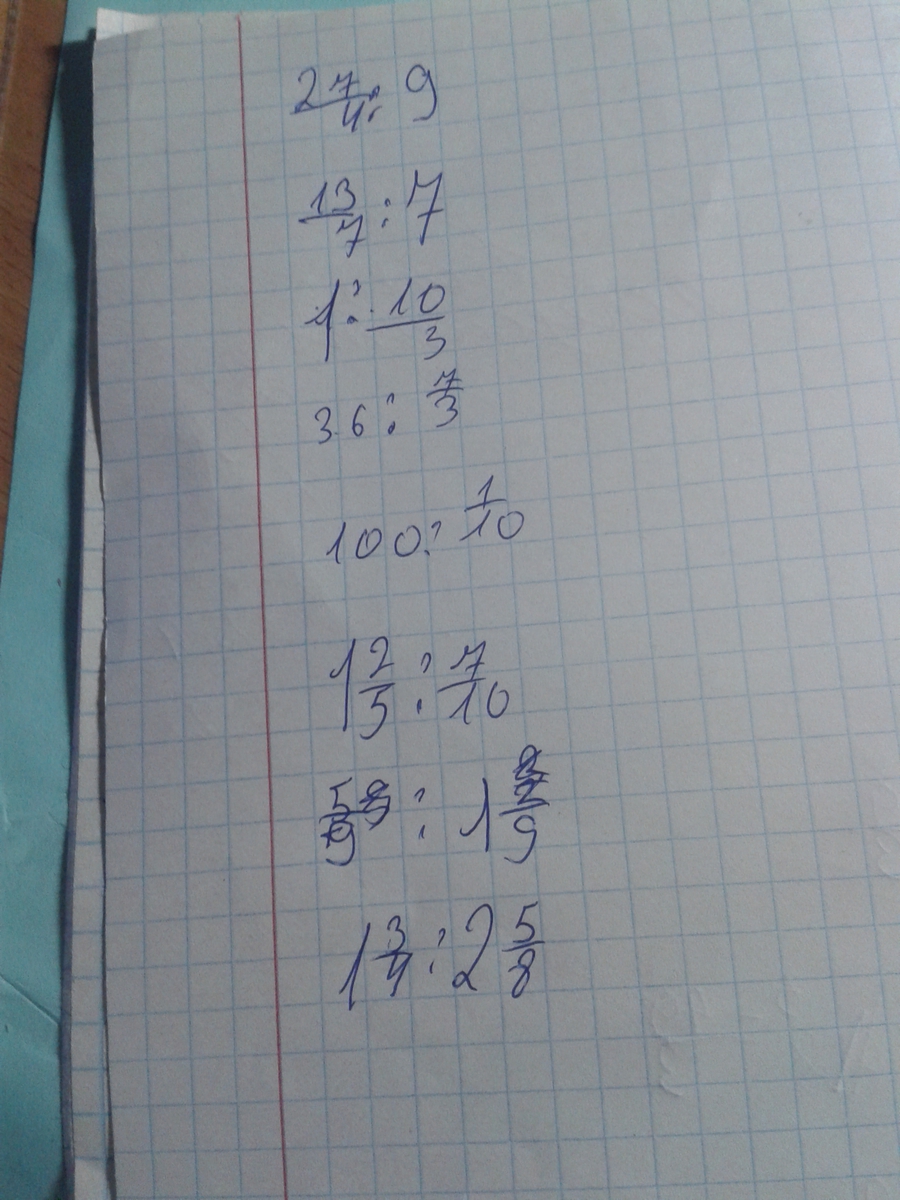 27/4 : 9 = 27/4 * 1/9 = 3/4; 13/7 : 7 = 13/7 * 1/7 = 13/49; 1 : 10/3 = 1 * 3/10 = 3/10; 36 : 7/3 = 36 * 3/7 = 108/7 = 7 3/7; 100 : 1/10 = 100 * 10/1 = 1000; 1 2/5 : 7/10 = 7/5 * 10/7 = 2; 5/9 : 1 2/9 = 5/9 * 9/11 = 5/11; 1 3/4 : 2 5/8 = 7/4 * 8/21 = 2/3.