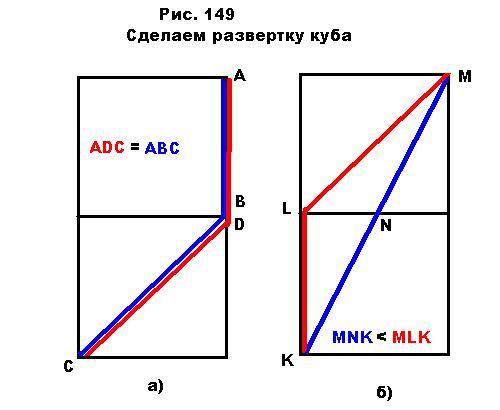 МLK состоит из одного ребра и одной диагонали, ломаная MNK превращается в прямую MK, которая всегда короче, чем сумма двух других сторон треугольника.
