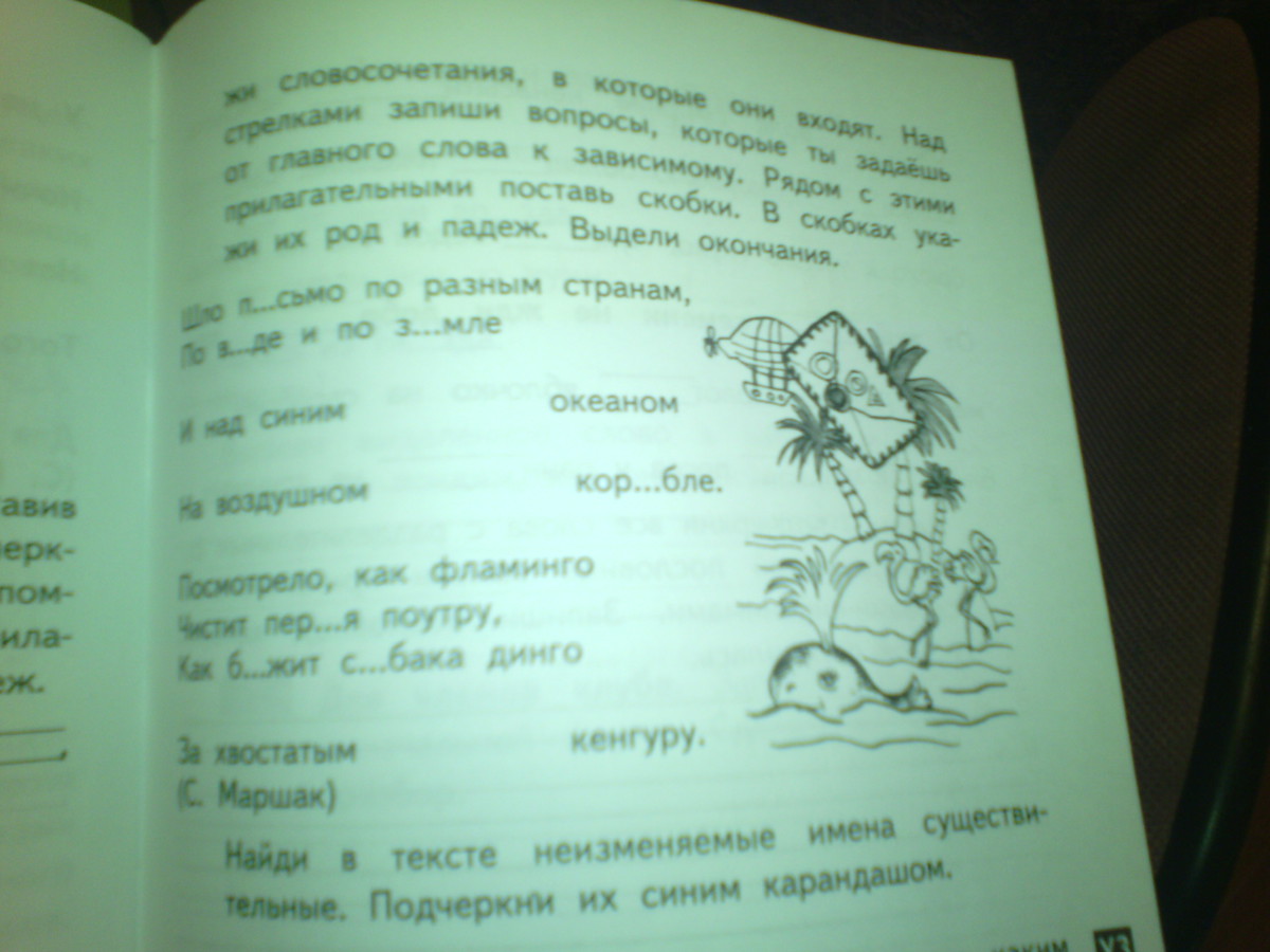 Шло письмо по разным странам по воде и по земле и над синим океаном на воздушном корабле посмотрело, как фламинго чистит перья поутру,ка бежит собака динго за хвостатым кенгуру