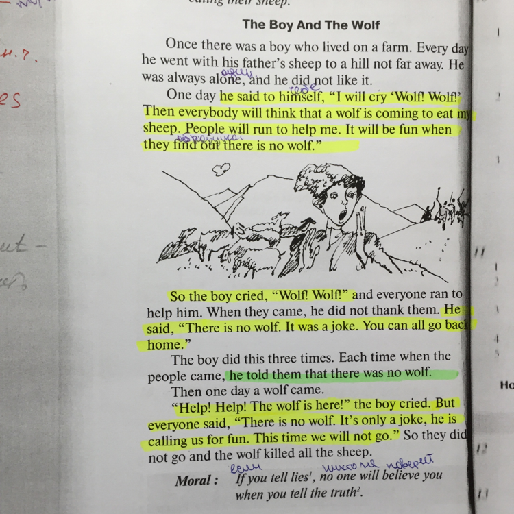 он заплакал. "волки!волки!" и все побежали помогать ему.когда они пришли,он не поблагодарил их. он сказал:"здесь нет волков,это шутка,вы все можете возвращаться домой"