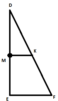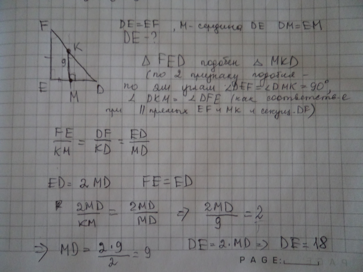 В прямоугольному треугольнику DEF DE=EF, точка M - средина DE. Через точку M проведено прямую перпендикулярную к катету DE, которая проходит гипотенузу DF в точке, MK=9 см.Найдите длину катета DE.