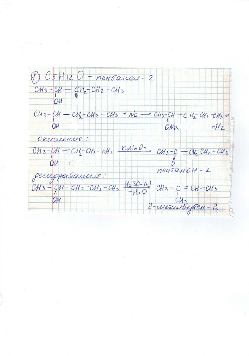 1. Напишите структурную формулу в-ва состава c5h12o,если известно, что оно реагирует с металлическим натрием, с выделением H . Окисление даёт кетон c5h10o и при дегидратации образуется 2-метил-2бутен.
